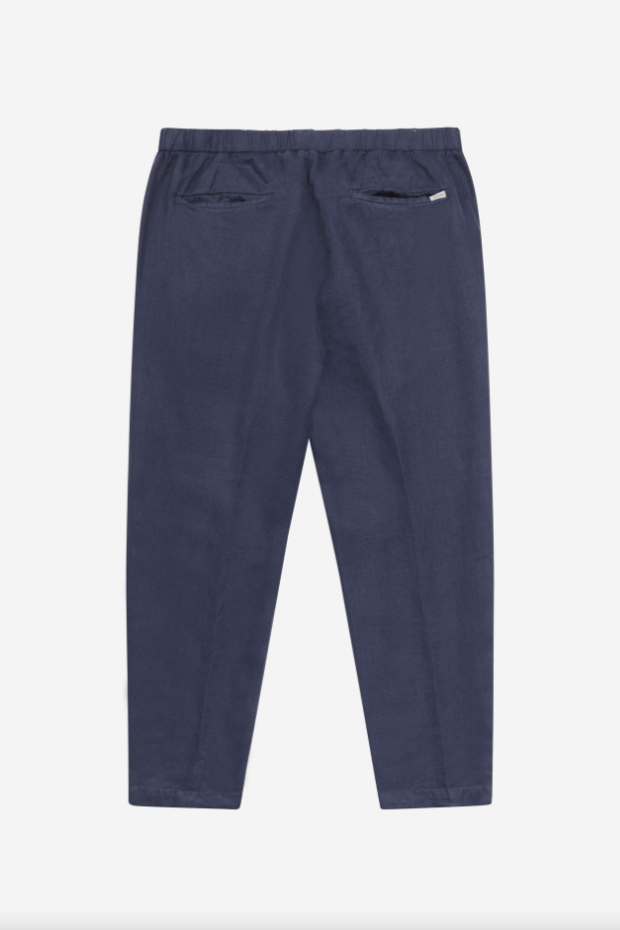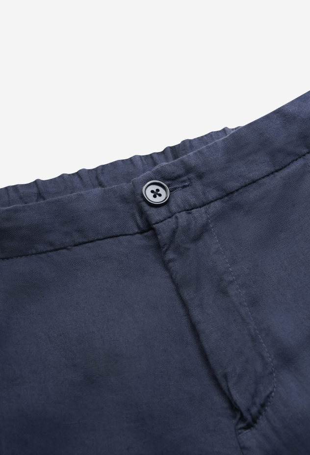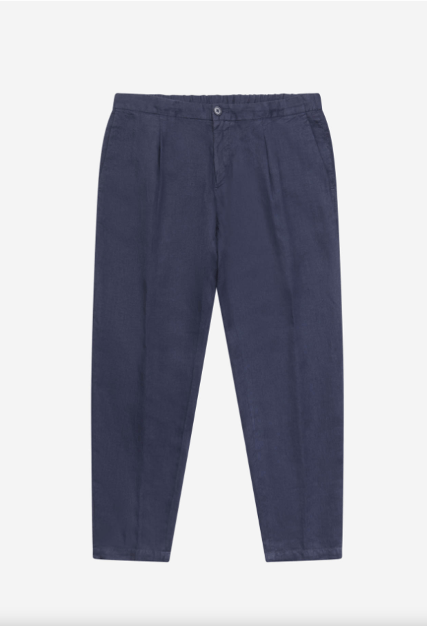 Брюки-чинос выполнены из льна, длина штанин приоткрывает голеностопный сустав, с тыльной стороны брюки снабжены двумя карманами, которые снаружи видны только в виде узких прорезей, а передние карманы размещены по диагонали, регулировать посадку брюк можно при помощи внутренней кулиски.
