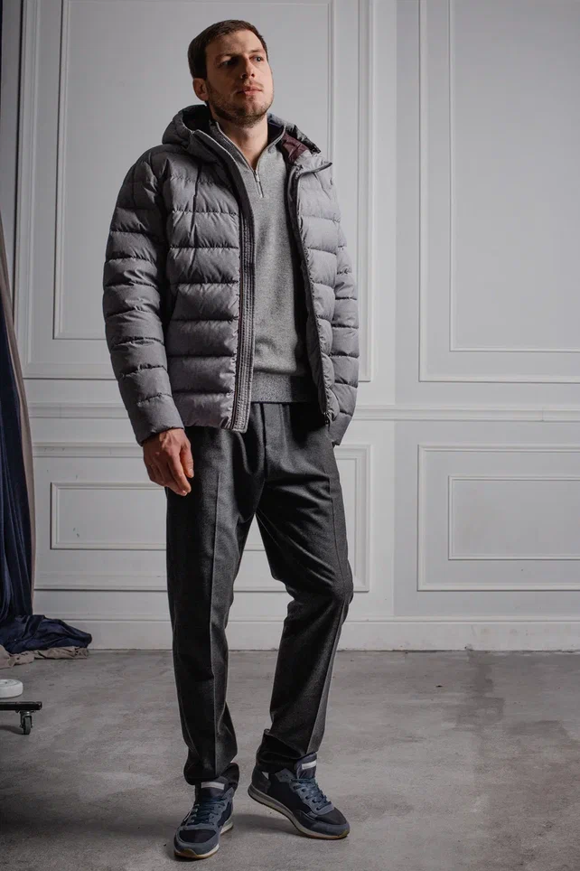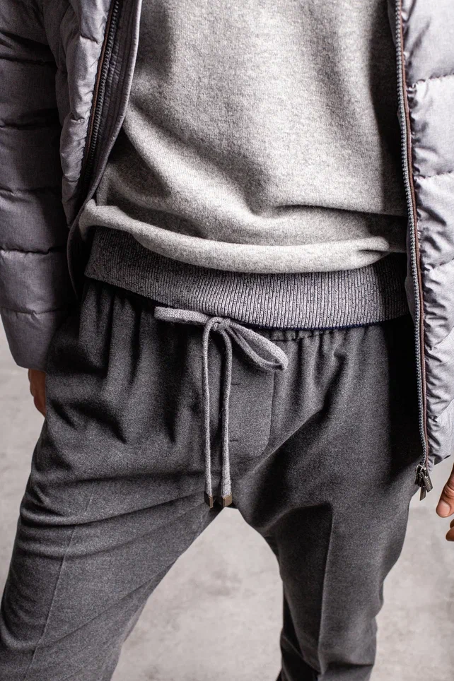 Брюки на кулиске универсального серого цвета из мягкого фактурного волокна. Благодаря эластичным волокнам вещь из осенне-зимней коллекции почти не мнется и не вытянется на коленях со временем. Однотонная модель без декора станет удачной инвестицией в повседневный гардероб.