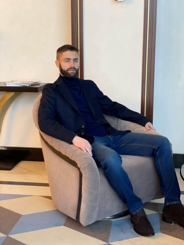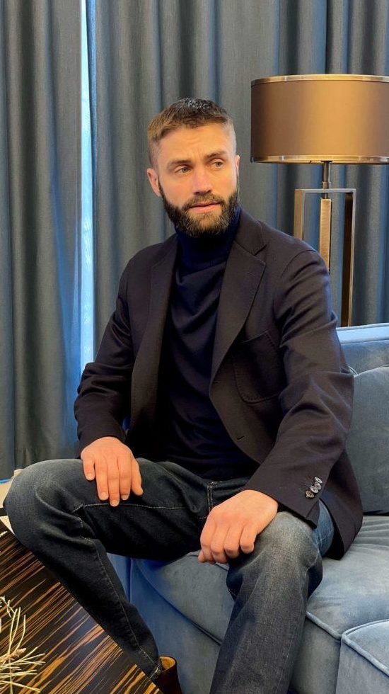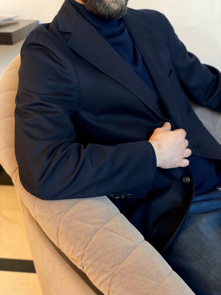 Пиджак с мягким силуэтом, как у кардигана. Чтобы добиться такого эффекта, изделие выполнили без подклада, а традиционную плотную костюмную ткань заменили легким трикотажем на основе мягкой шерсти и хлопка. В состав материала добавили прочные нити полиамида, поэтому вещь практически не мнется.