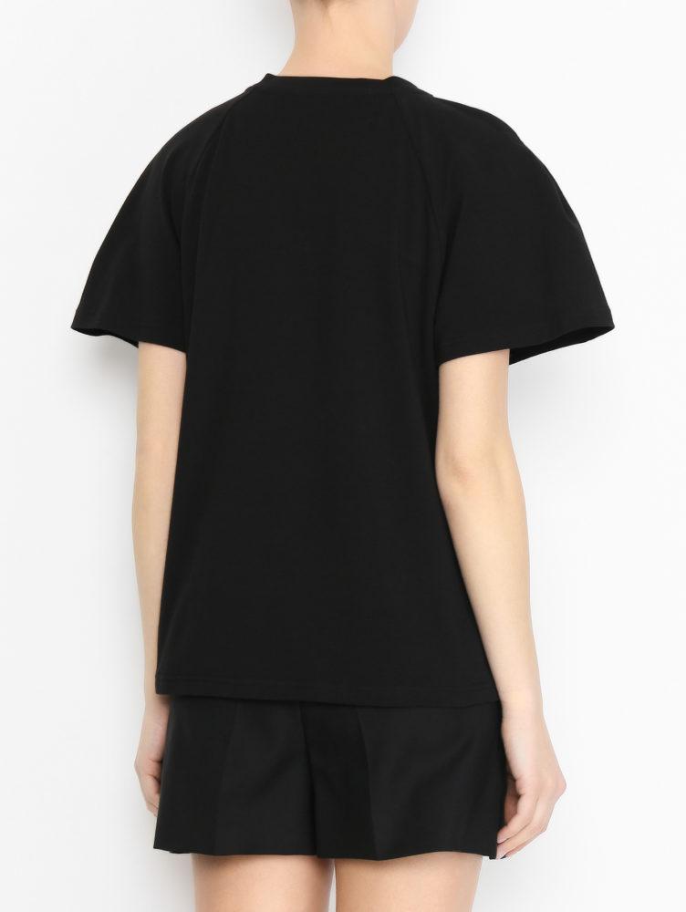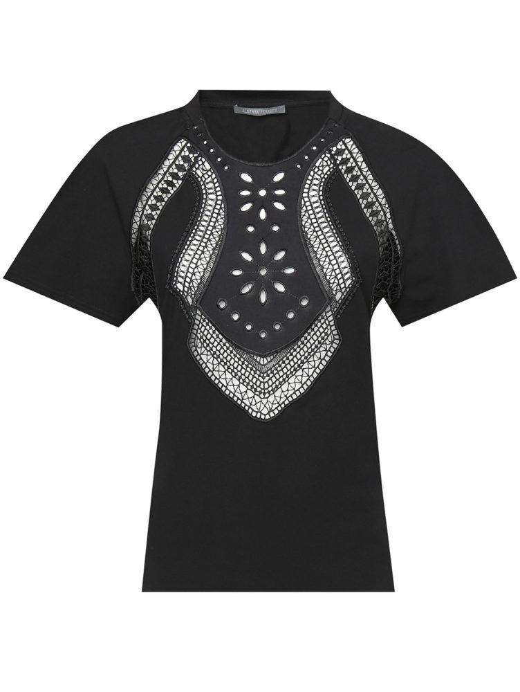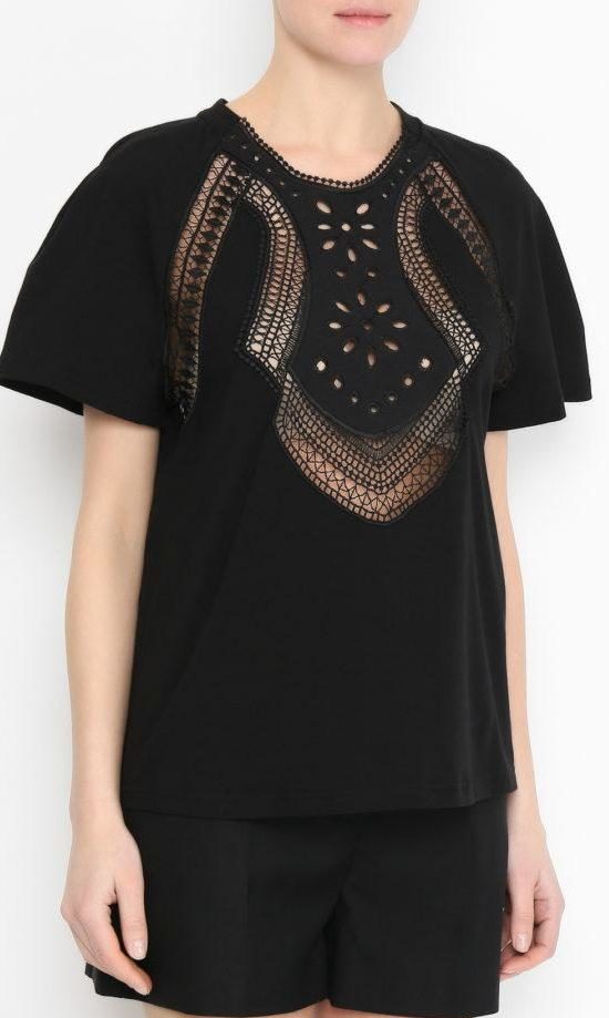 Черная футболка оверсайз с коротким широким рукавом и круглым вырезом оформлена вышивкой с ажурным узором на груди. Эта модель из коллекции Alberta Ferretti станет спутницей контрастной юбки в романтическом стиле или цветных брюк. добавляя образу особый шарм.
