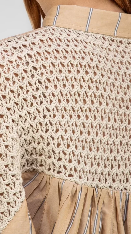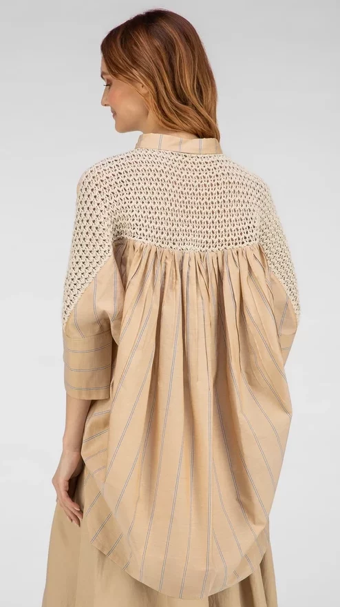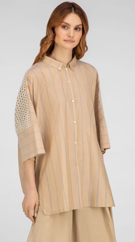 Рубашка с короткими широкими рукавами с вязаными вставками от GENTRY PORTOFINO. Плиссировка сзади, классический воротник, свободный крой оверсайз с боковыми разрезами. Модель в бежевом цвете отлично подойдет как для работы, так и для отдыха.