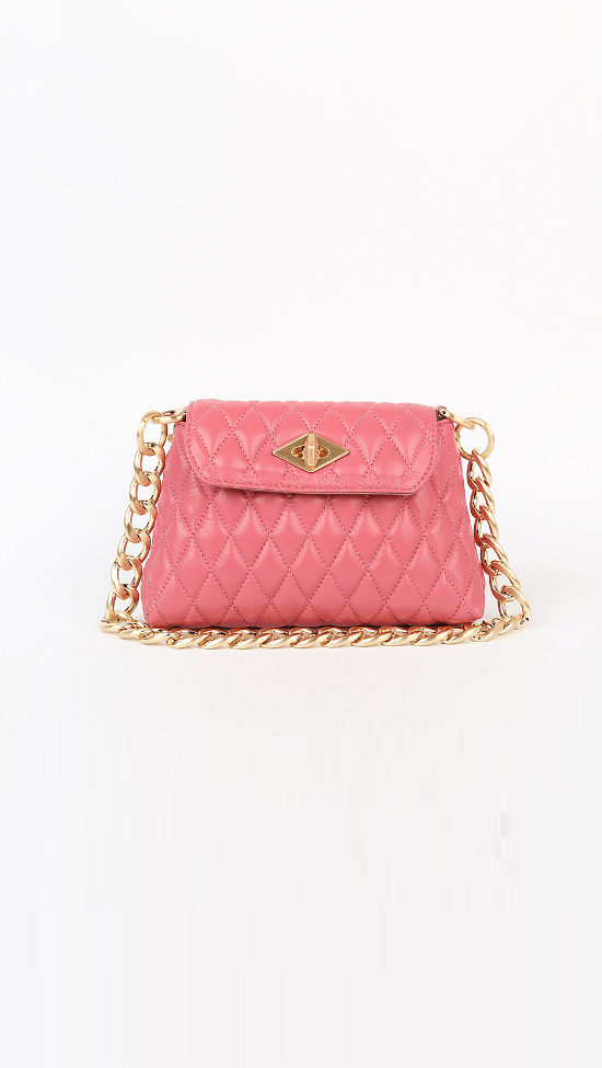 Сумка приглушенного розового цвета выполнена из мягкой кожи в технике простежка. Модель дополнили крупной цепью и плечевым кожаным ремнем. Каждое звено прошло семь этапов производства. Сначала мастера марки добиваются точного размера каждой детали, потом покрывают ее золотом и пленкой, создающей защитный слой.