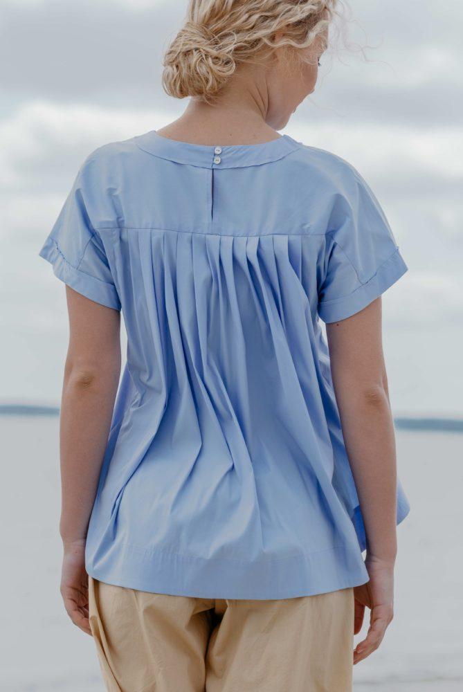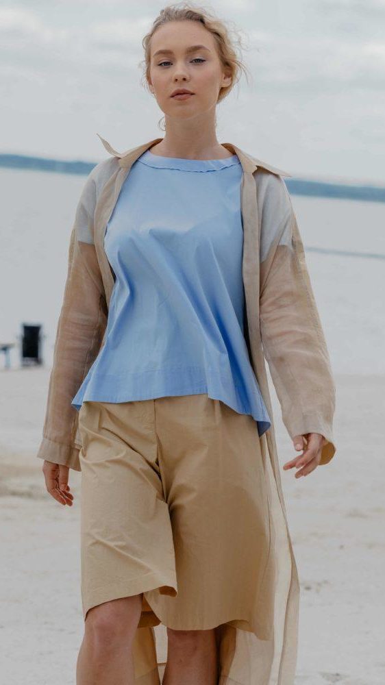 Блуза небесно- голубого оттенка из тонкого органического хлопка. Его вырастили без применения химикатов, поэтому материал получился мягче, чем из обычного. Свободная модель со спущенным плечом не сковывает движения и не мешает коже дышать, обеспечивая комфорт в теплый день. Отличный вариант, как самостоятельное изделие, так же база под жакет.