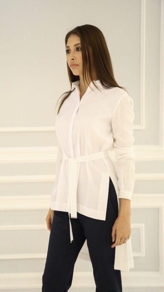Белоснежная рубашка с поясом, отложным воротником и удлиненной спинкой идеально впишется в гардероб. Для ее пошива использовали тонкий гладкий хлопок спереди, который хорошо пропускающий воздух; спинка изделия изготовлена из нежного шелка.