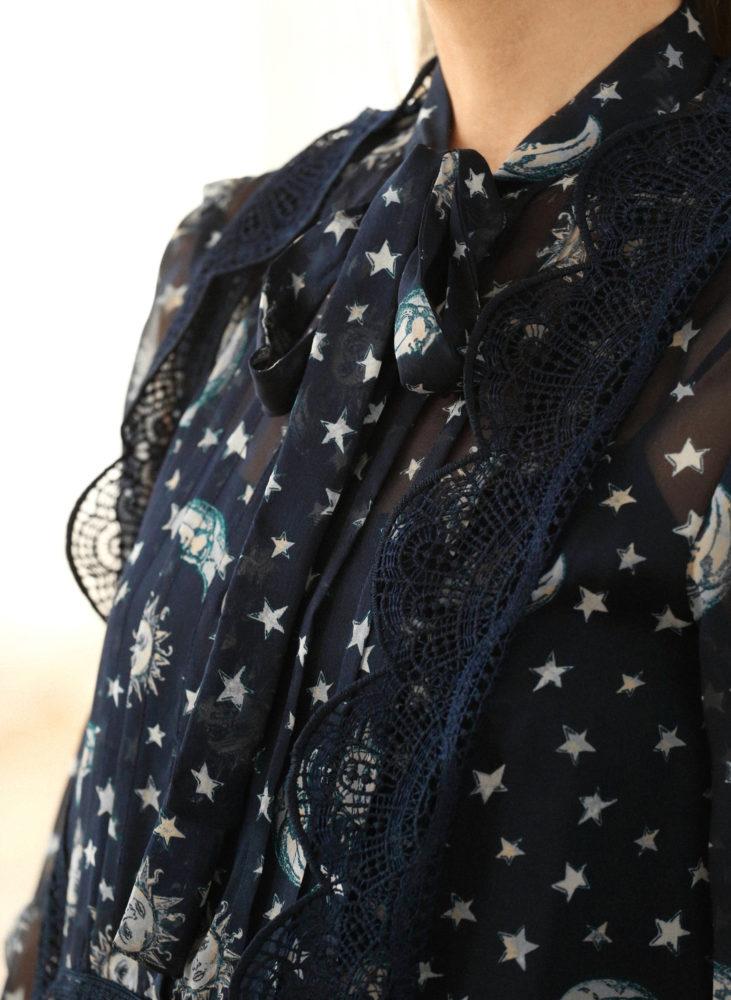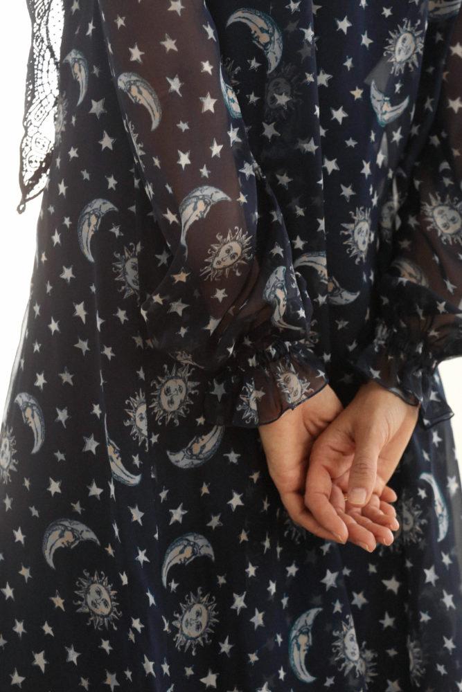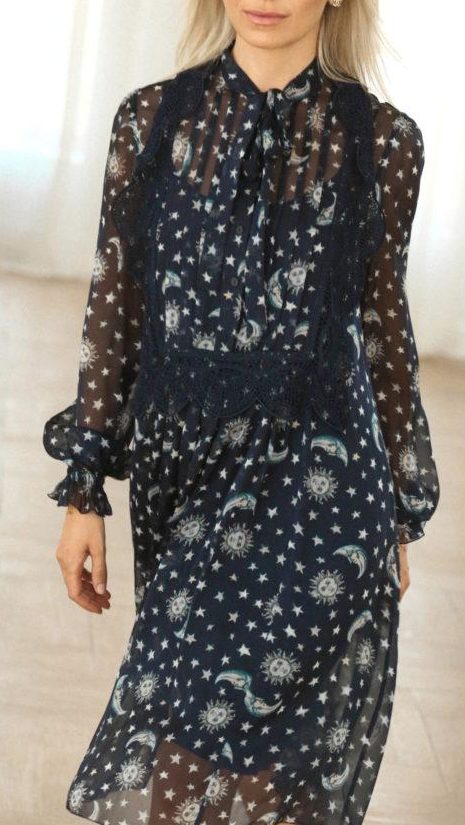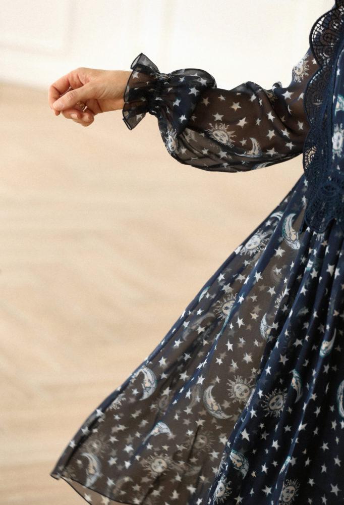 Воздушное, струящееся платье из прозрачного шифона с шелковой комбинацией. Галстук-бант и вставки из кружева делают образ еще более романтичным и женственным.