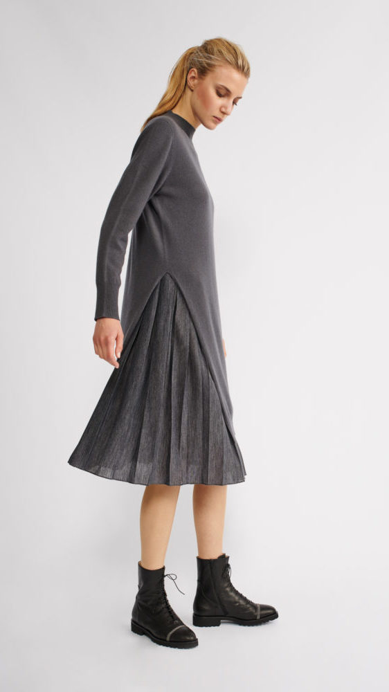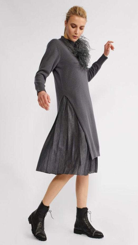 Платье из осенне-зимней коллекции состоит из двух вариации с юбкой плиссе и верхним трикотажным чехлом с разрезом. Свободный непринужденный крой подружили с мягкой шерстью и кашемиром, которые делают изделие уютным, словно свитер. Данное платье предполагает большую вариативность Ваших образов, как нижний вариант платья в комбинации со свитшотом, так и верхний чехол с узкими брюками.