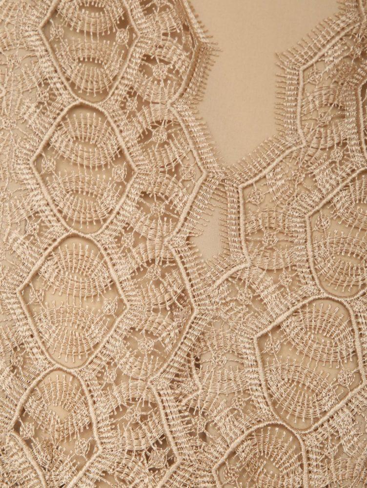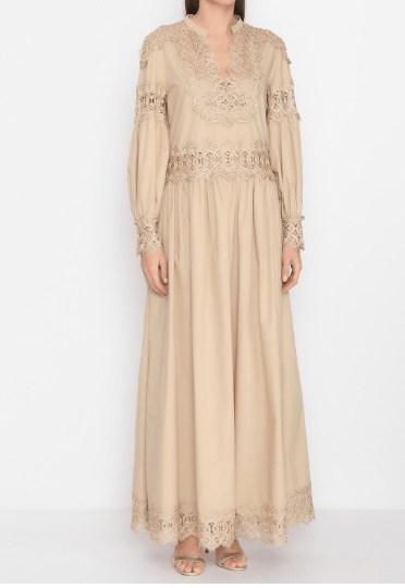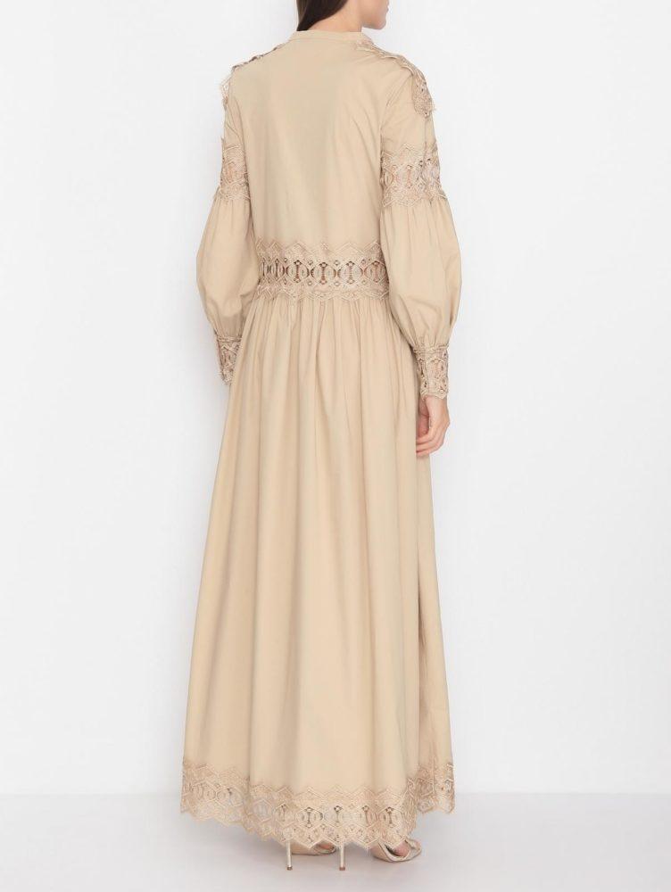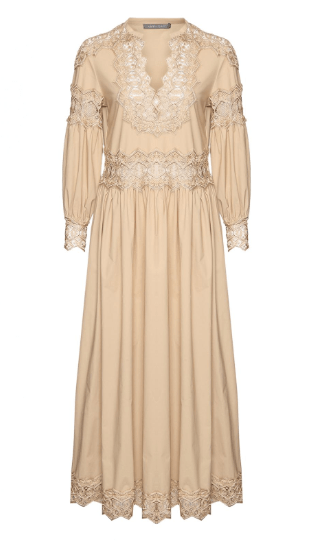 Платье-макси из коллекции Alberta Ferretti выполнено из хлопковой ткани бежевого оттенка и роскошно оформлено кружевной вышивкой на груди и манжетах длинных объемных рукавов. Эта модель в стиле бохо с подчеркнутой талией и свободной юбкой гармонирует с изящными босоножками или казаками.
