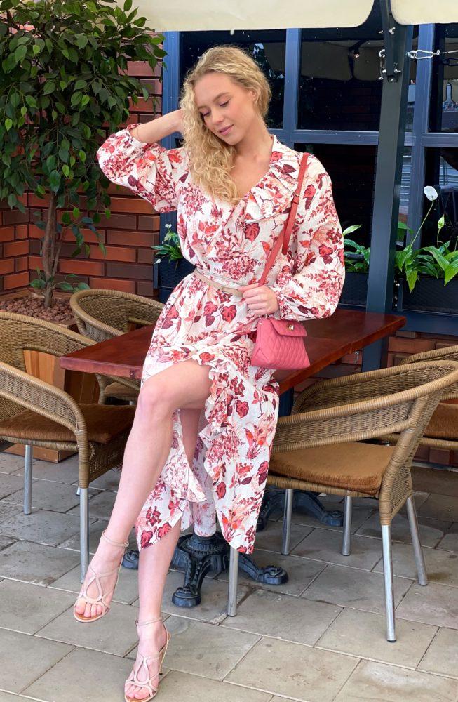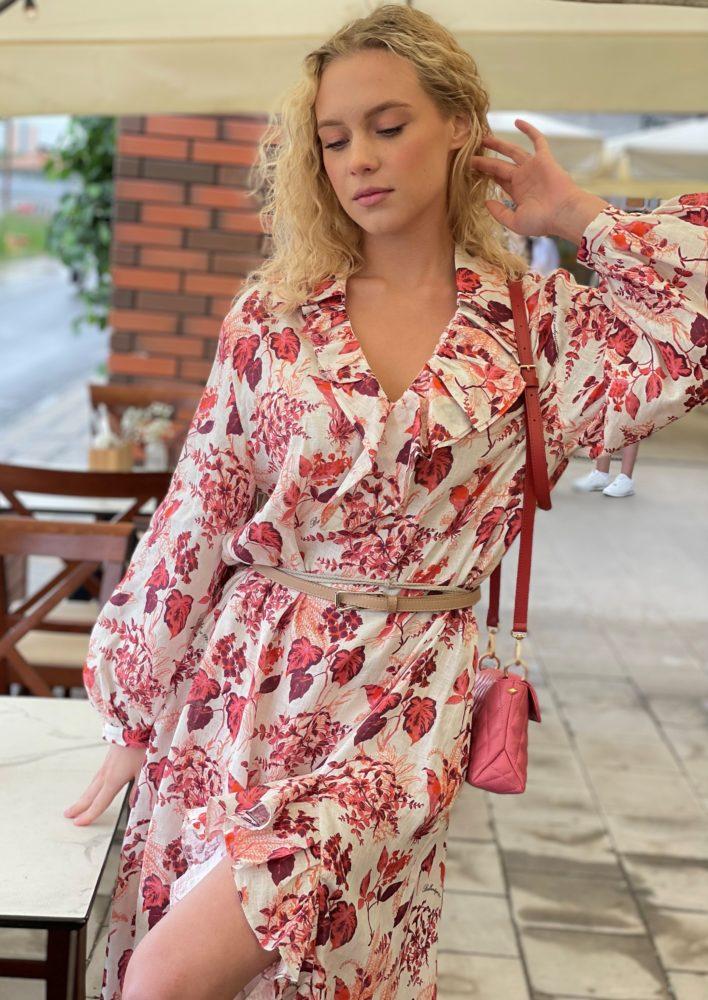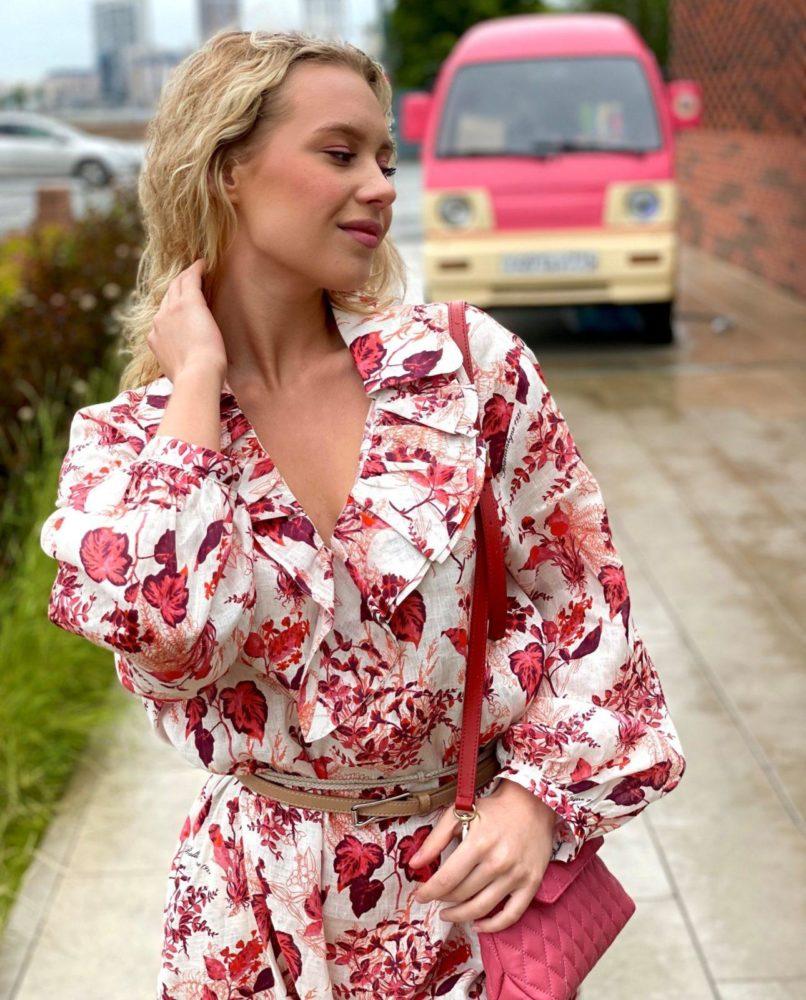Легкое романтичное платье длиной миди с цветочным принтом, задаст правильное настроение на весь день. 100% лен хорошо пропускает воздух, отвечая за комфорт в течении всего дня.