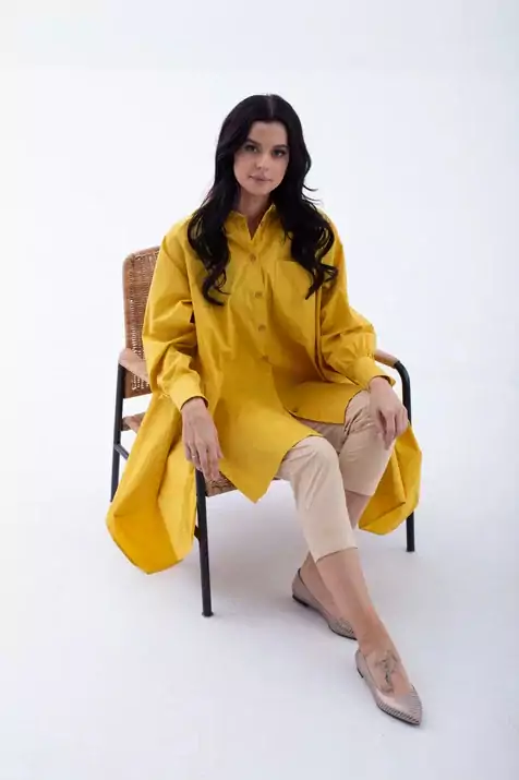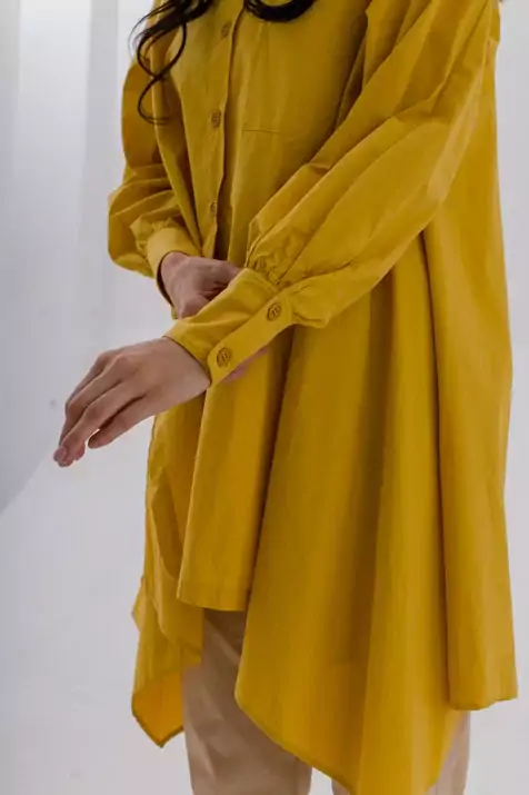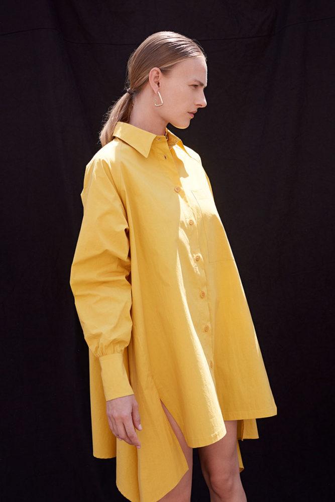 Платье-рубашка на пуговицах . Модель выполнена из тонкого органического хлопка. Практический невесомый хлопок рубашечного типа обеспечивает превосходную воздухопроницаемость, сохранность формы и легкость в уходе. Архитектурный крой делает платье уникальным. Лаконичная модель идеально подойдет для практичных и женственных городских аутфитов. Желтый оттенок поможет добавить летнего настроения в повседневный гардероб.