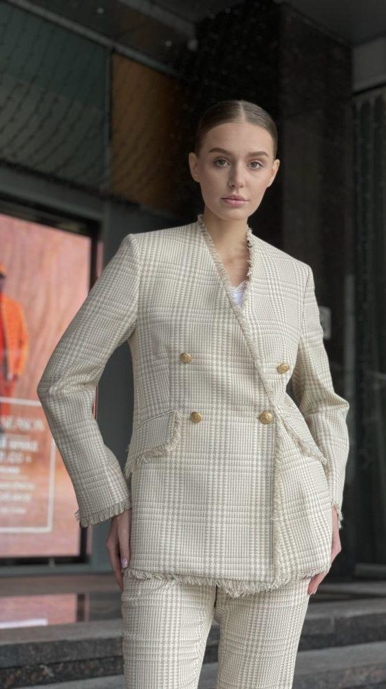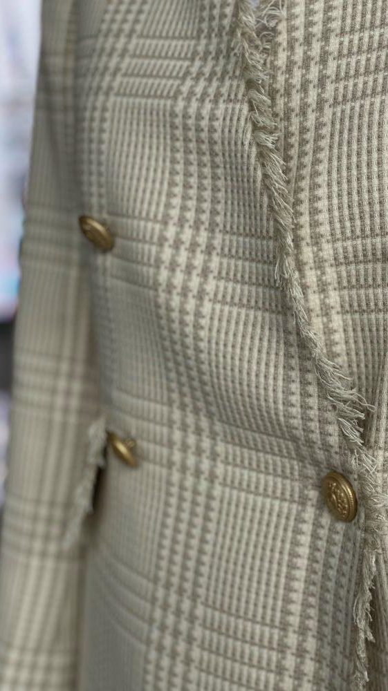 Жакет от итальянского бренда, с двухцветным узором и V-образным вырезом. По всем открытым краям изделия украшена нежной бахромой. Модель немного приталена за счет вытачек спереди, а большие золотые пуговицы, выполненные под старину, добавляют ей особой изысканности.