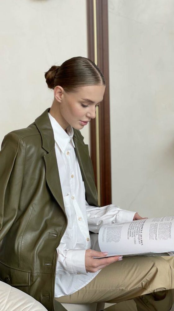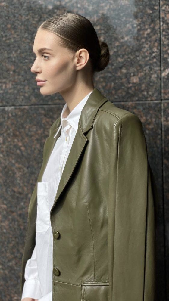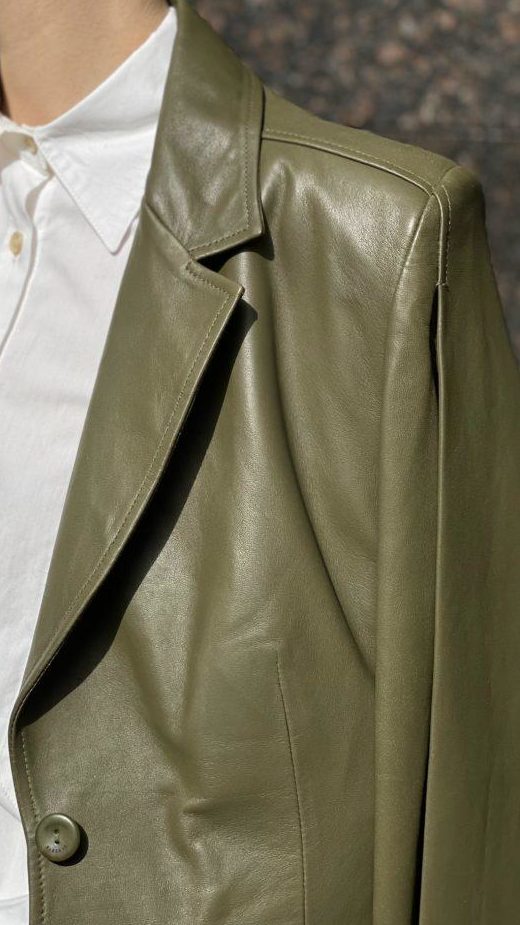 Кожаный жакет от модного итальянского бренда Alberta Ferretti, в лаконичном зеленом цвете, с V-образный вырезом, и двумя просторными карманами, расположенными по бокам изделия. Прекрасно будет сочетаться с шерстяной или кашемировой водолазкой, свитером крупной вязки, джинсами любого кроя, юбкой плисе.