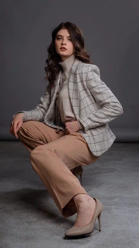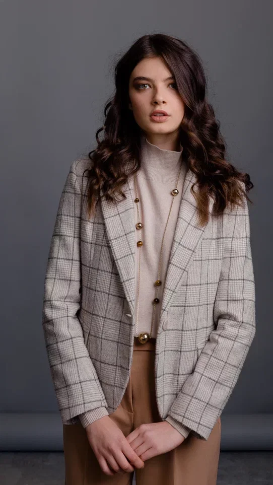 Жакет в деловом стиле, выполнен из фактурной шерсти и кашемира. Данный жакет очень комфортный и мягкий, согреет Вас в холодную погоду.