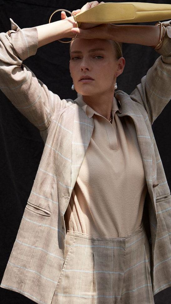 Однобортный пиджак в клетку в бежевом оттенке легко впишется в офисный образ, который наши стилисты предлагают дополнить брюками, блузой . Данная модель сшита из дышащего льна и тонкой немнущейся вискозы.