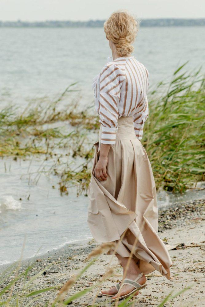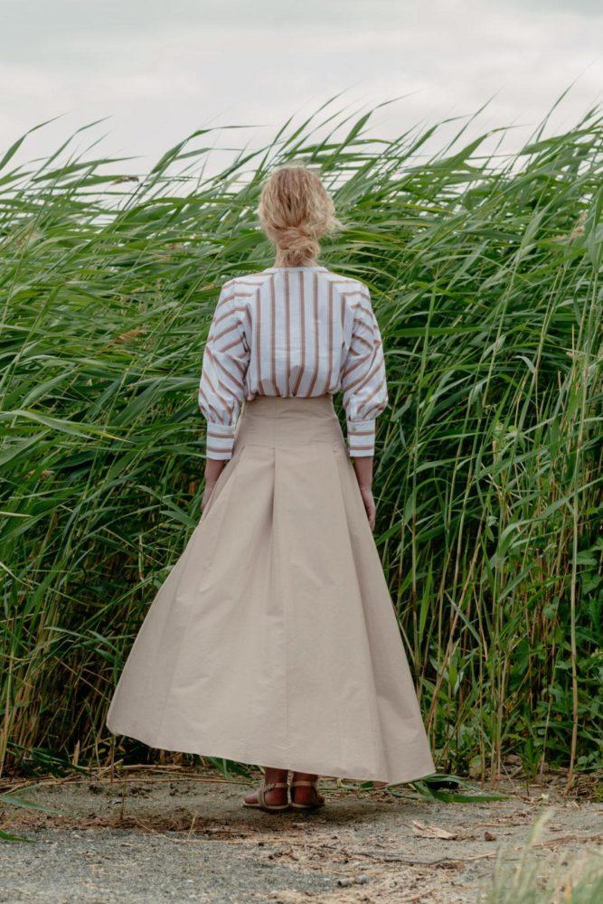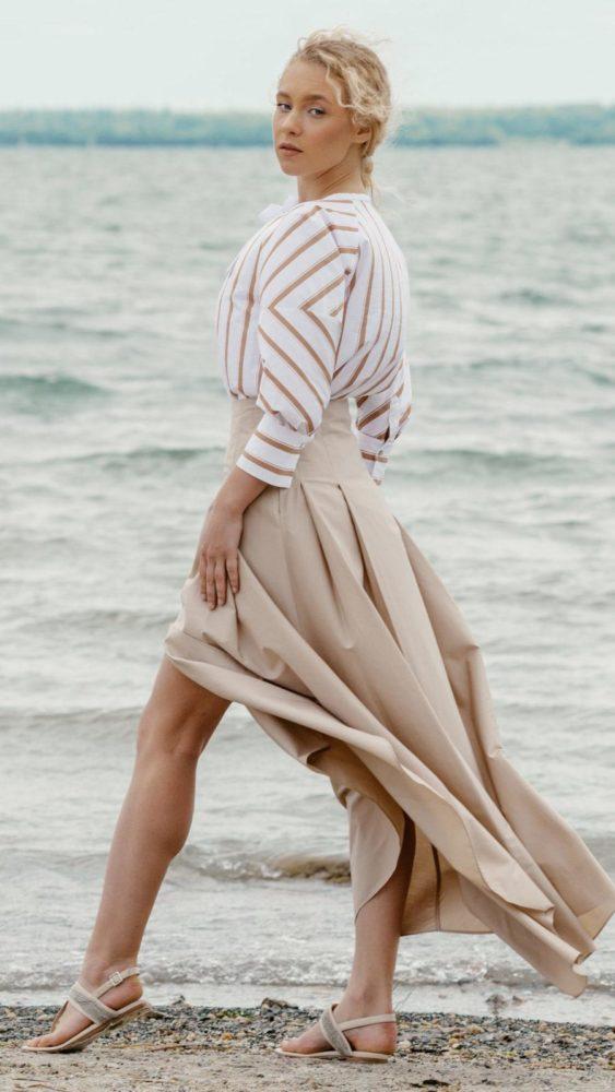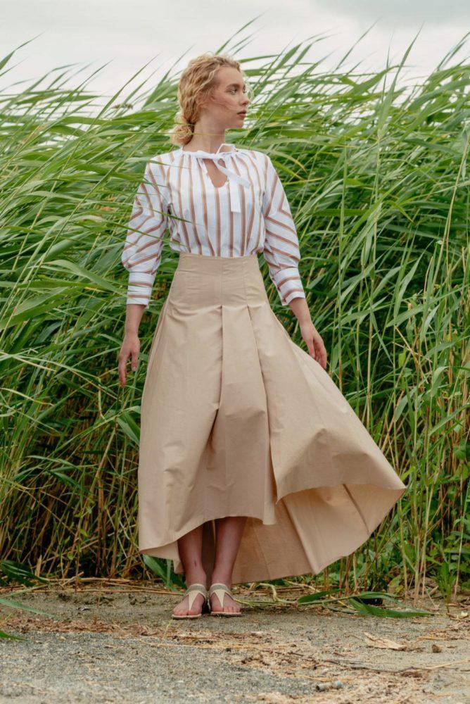 Юбка-годе с втачными клиньями ассиметричного кроя и разрезом спереди.