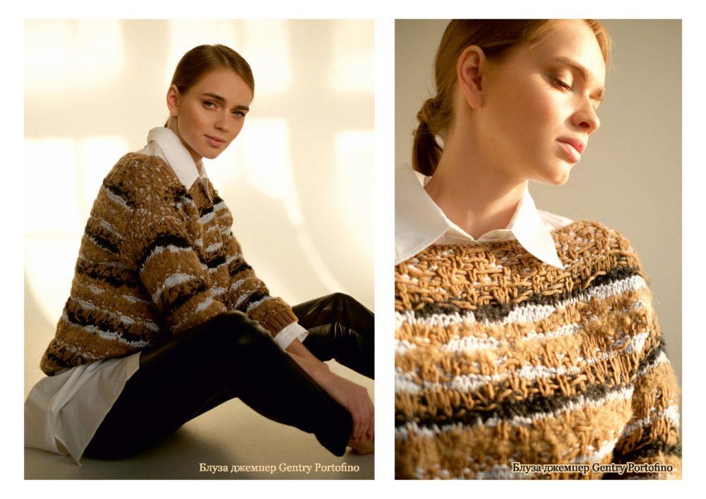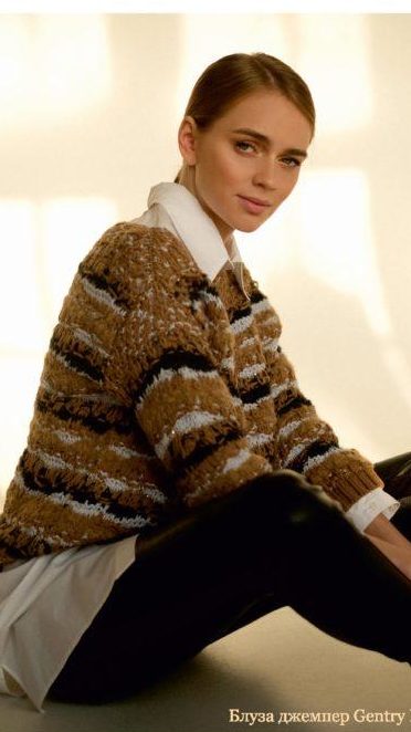 Джемпер из осенне-зимней коллекции выполнен в природных оттенках. Отлично смотрится как самостоятельно, так и в комплекте с рубашкой. Эффект фактурности создают не только разные оттенки, но и нежная пряжа: на фоне гладких нитей особенно эффектно выглядит фактурный мотив, подчеркнутый сверкающими пайетками (их вплели в материал, чтобы полотно выглядело однородным). Благодаря составу, джемпер невероятно мягкий и приятный к телу.