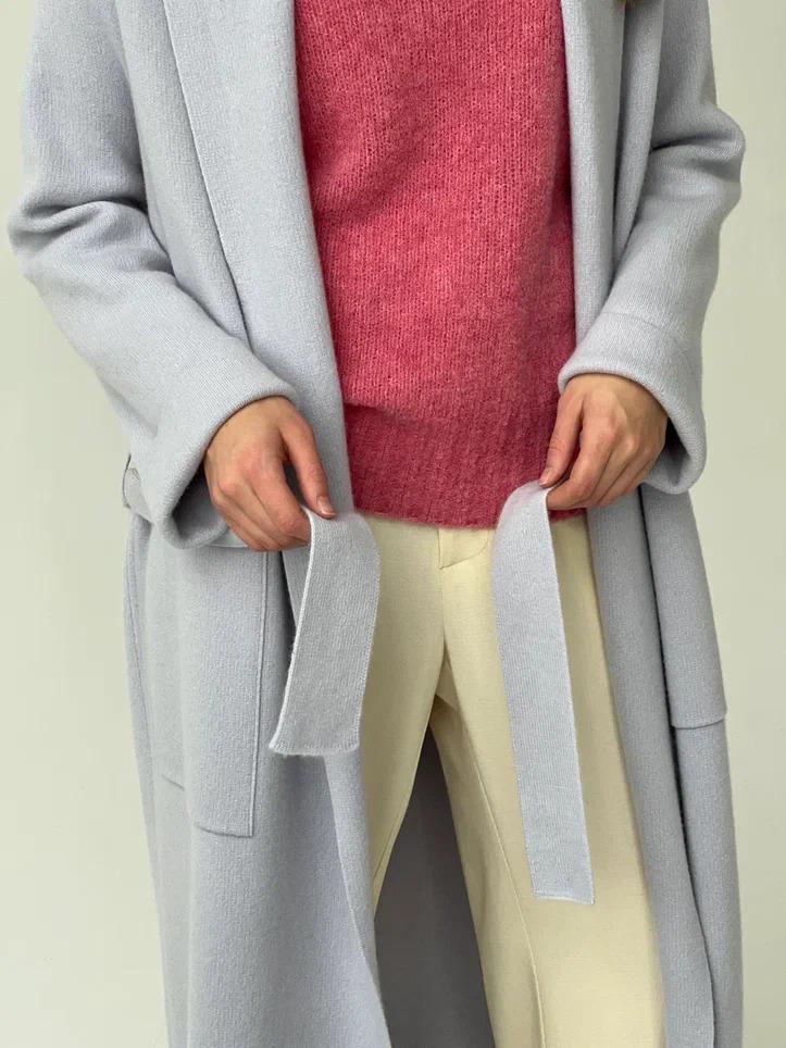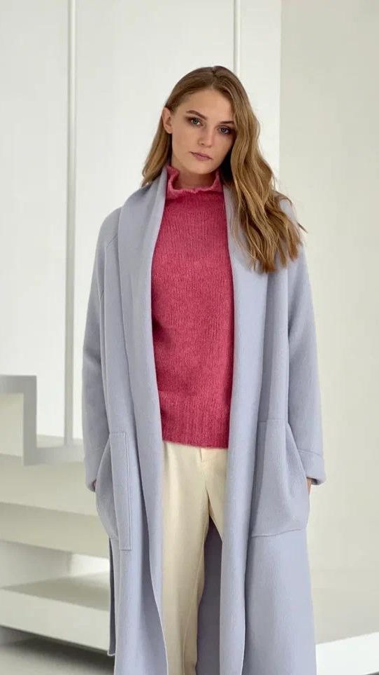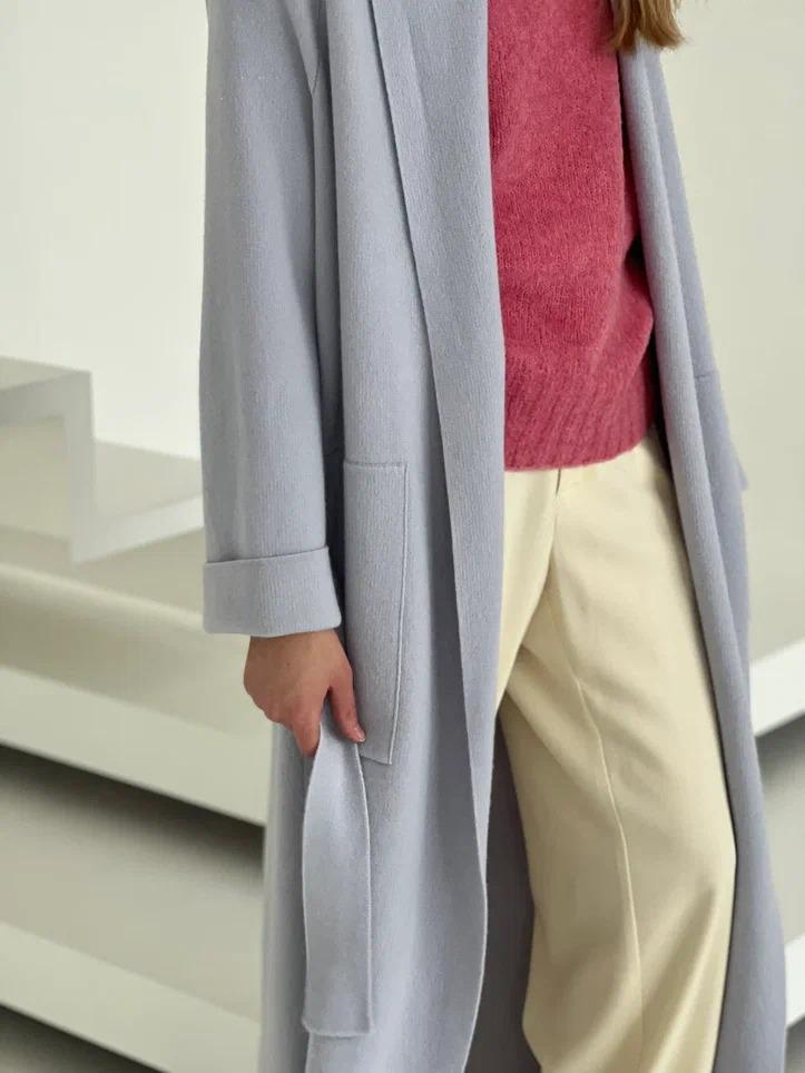 Лаконичный светло-голубой кардиган одинаково гармонично дополнит и повседневный образ, и заменит верхнюю одежду весенний период. Связали модель из особенно нежного кашемира. Мягкую пряжу изготовили из пуха горных монгольских козлят: его вычесали вручную и промыли ключевой водой, поэтому вещь получилась легкой и нежной как облако. Удлиненный кардиган одинаково хорошо сочетается как с монохромной одеждой, так и с контрастной. Изделие вошло в коллекцию сезона осень-зима.