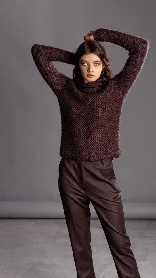 Свитер в красивом шоколадном оттенке, выполнен крупной фактурной вязкой из мохера и шерсти. Модель прямого кроя, не добавляет лишних объемов.