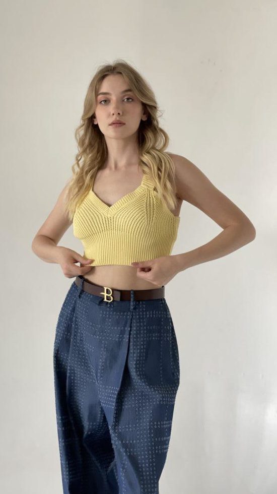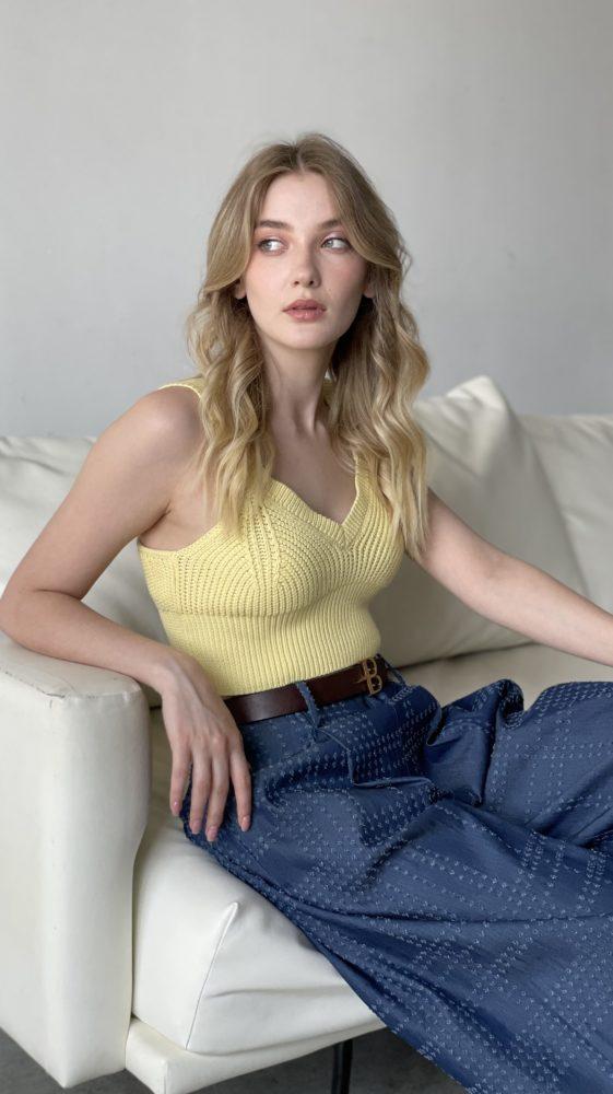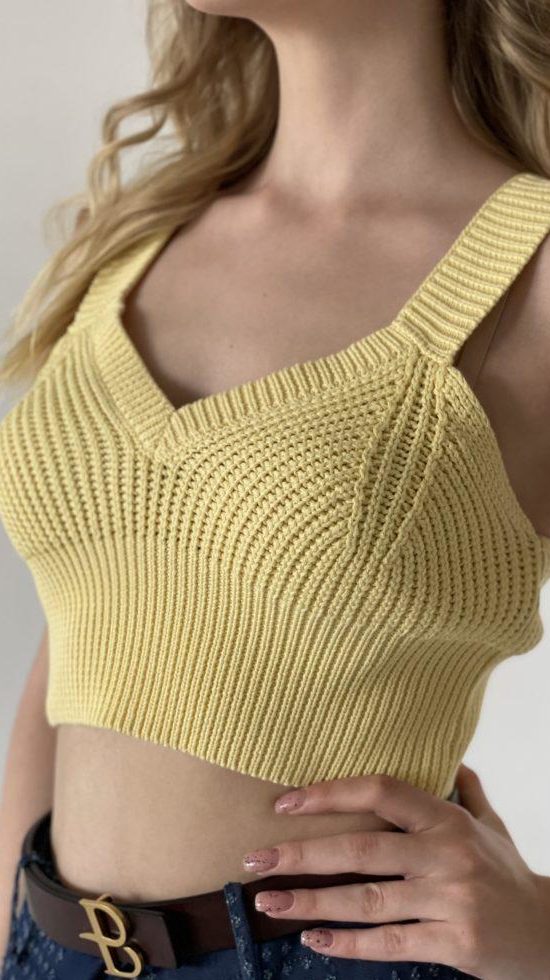 Короткий топ из воздушной мягкой вязки с V-образным вырезом, широкими бретелями и резинкой по низу. Модель не оставит равнодушной ни одну модницу! Выполнен из высококачественной импортной пряжи, комфортный к телу. Будет прекрасным дополнением к блузке или платью-рубашке.