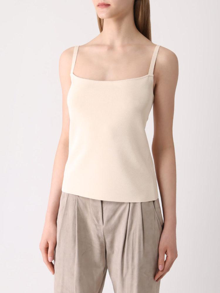 Для изготовления топа на бретелях в базовом бежевом цвете использовали нежную вискозу. Такому материалу нет равных в терморегуляции, поэтому изделие комфортно носить на голое тело.