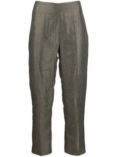 Укороченные брюки с эффектом сжатой ткани идеально подойдут как для дневных образов, так и для нарядных вечерних. Благородный оттенок приглушенного зеленого отлично сочетается с базовыми цветами. Шарм брюкам придает само волокно, состоящее из гладкого льна и металлизированной нити.