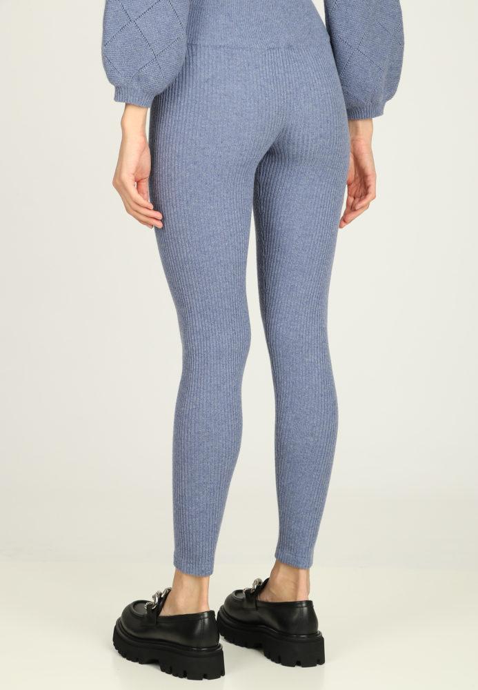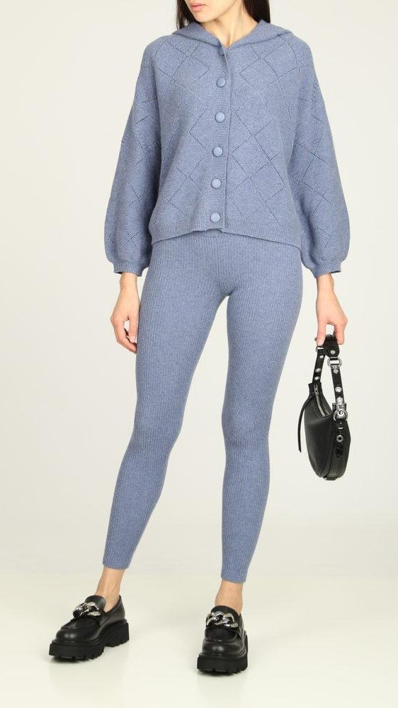 Эластичная вязка в рубчик помогут небесно-синим леггинсам идеально облегать фигуру, плавно повторяя движения тела, и сохраняя при этом форму от растяжения. Модель сшита из тонкого, но теплого трикотажа на основе кашемира, вручную вычесанного из подшерстка горных коз, чьи волокна настолько легки, что одежда едва ли ощущается на теле.