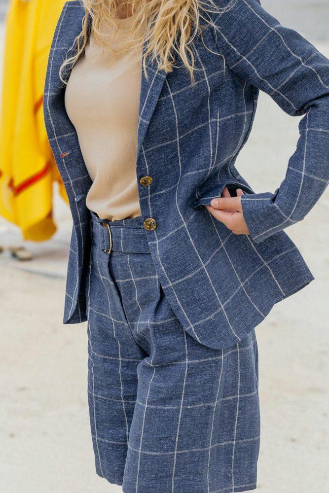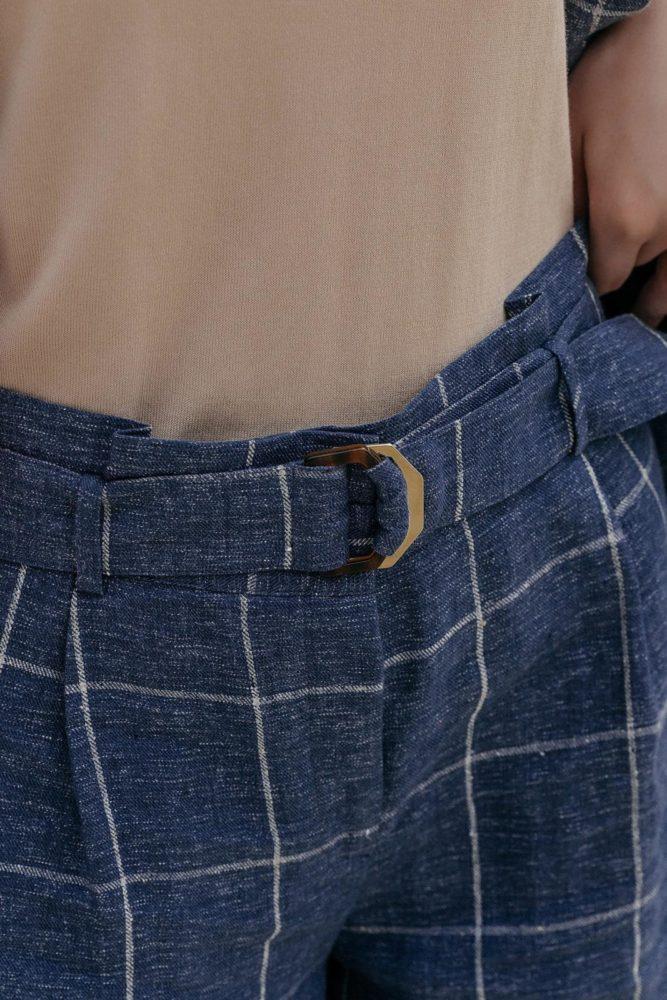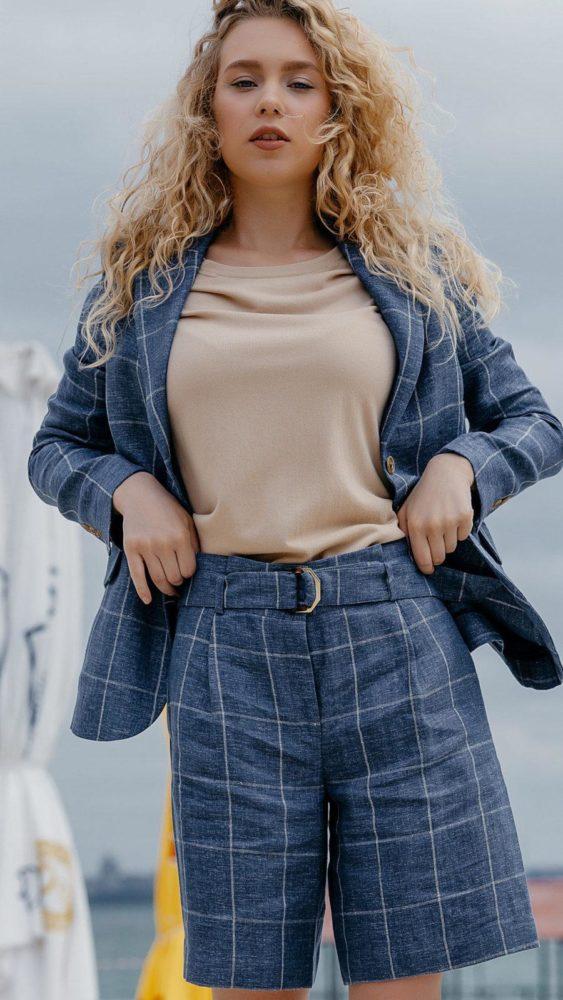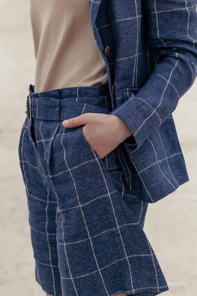 Льняные шорты в клетку глубокого синего цвета, средняя посадка и защипы спереди прекрасно подчеркивают достоинства фигуры.