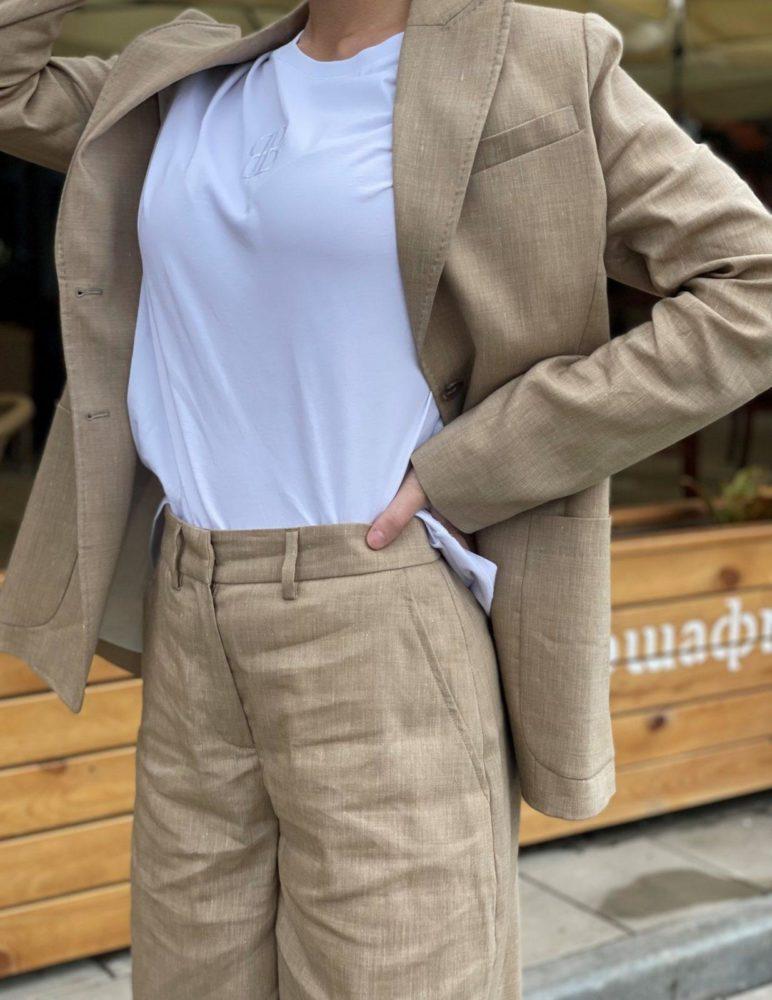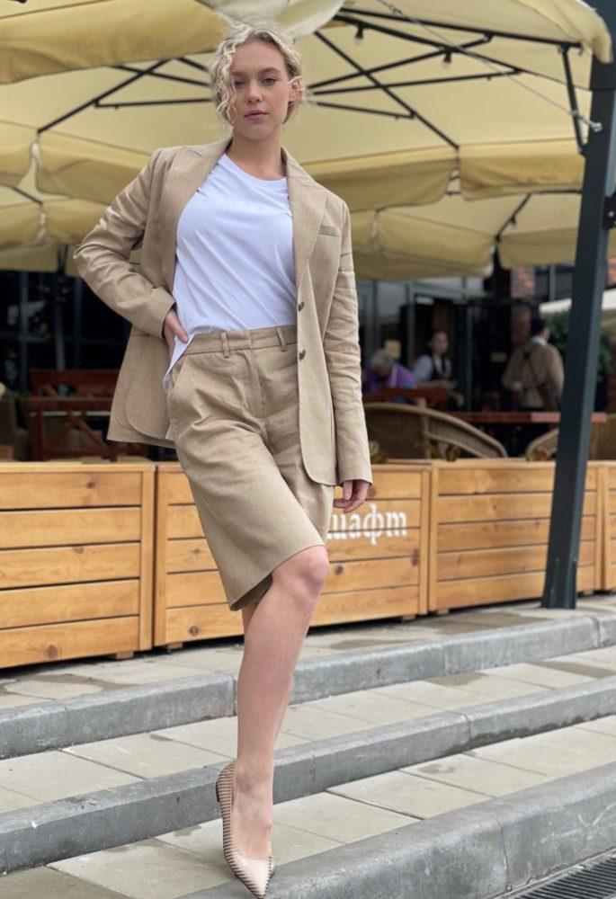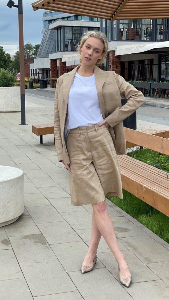Классические бежевые шорты из льна. Ткань хорошо пропускает воздух. Стилисты предлагают собрать повседневный образ с футболкой и мюлями, а если добавить жакет, образ приобретет деловой настрой.