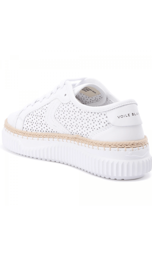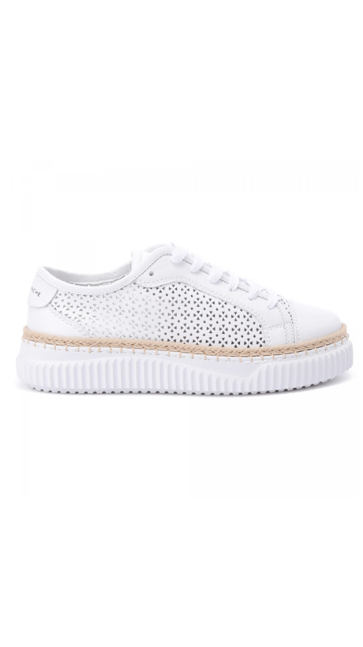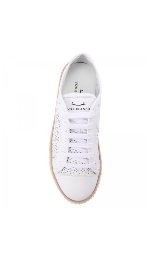 Кожаные кеды в белом цвете от Voile Blanche. Верхняя часть обуви из мягкой телячьей кожи украшена геометрическими вставками в виде цветов для создания лёгкого и дышащего эффекта. Носок, пятка и логотип сзади из гладкой кожи создают тонкий контраст, а плетёный шнур из рафии на ранте напоминает летнюю обувь. Сверхлёгкая резиновая подошва с рифлёным краем завершает дизайн. Модель содержит натуральные подкладки из кожи и съемные антибактериальные анатомические стельки.