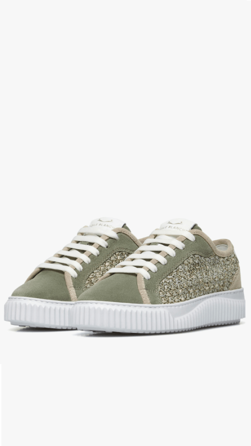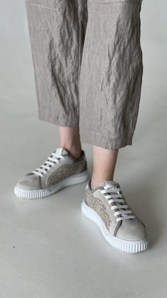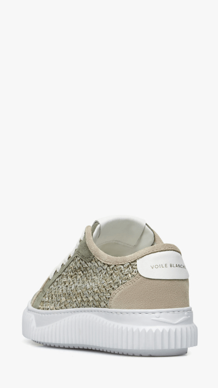 Кеды от Voile Blanche из замши и плетеной рафии, на шнуровке. Нить из люрекса придает изделию мерцающий оттенок, создавая гламурные городские образы. Кожаная окантовка, съемная стелька и сверхлегкая рифленая резиновая подошва завершают дизайн.
