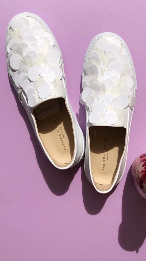 Слипоны универсального белого цвета с декором в виде крупных белых матовых пойеток. Для пошива модели с круглым мысом мастера бренда использовали мягкую кожу, которая со временем подстраивается под форму стопы.